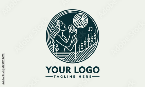 Obraz premium Vintage microphone illustration with musical notes and expressive hand gesture in decorative circular frame. Music concept