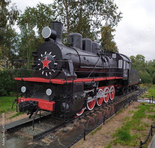 © Zhanna, Naklejka premium Vintage military black steam locomotive on rails