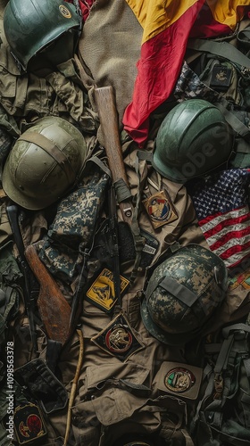© Kitta Studio, Fototapeta premium Vintage Military Gear Display Featuring Helmets, Flags, and Uniforms Create a Unique Tribute to Historical Military Heritage and Valor of Soldiers