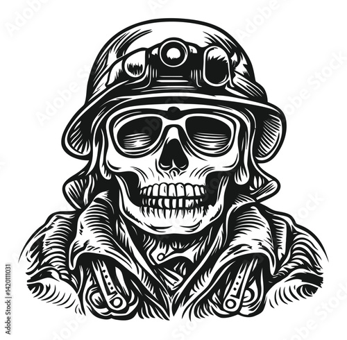 Fototapeta premium Vintage Military Skull With Helmet and Sunglasses Woodcut Style
