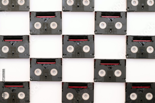 Obraz premium Vintage mini DV cassette tapes used for filming back in a day. Pattern made of plastic video tapes on white background