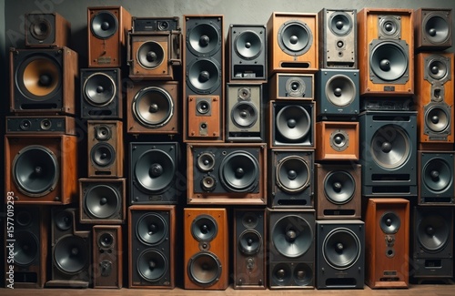 © miss irine, Obraz premium 16 vintage monochrome speakers on black surfaces. Brown wood paneling adorns the walls, rustic charm in music room. Cables connect speakers, contrasting with wood panels.