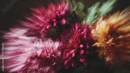 Naklejka premium Vintage Motion Blur Floral Still Life with Red Chrysanthemums in Vase