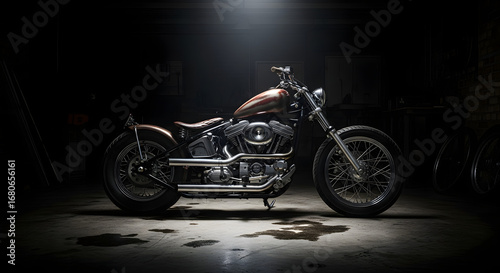 Fototapeta premium Vintage Motorcycle in Dimly Lit Garage, Classic American Chopper with Unique...