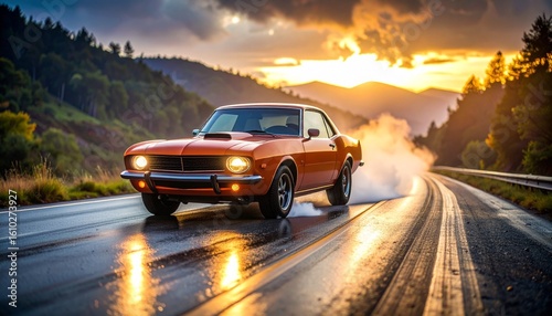 © FotoGal, Fototapeta premium Vintage Muscle Car Power Slide at Dusk