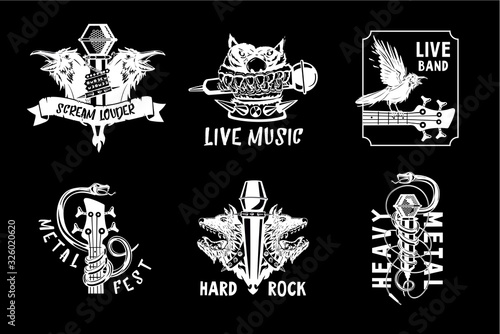 Fototapeta premium Vintage music emblem. Tattoo style illustration pack for rock and rap music. Heavy metal and hip-hop style. Retro design vector icons.