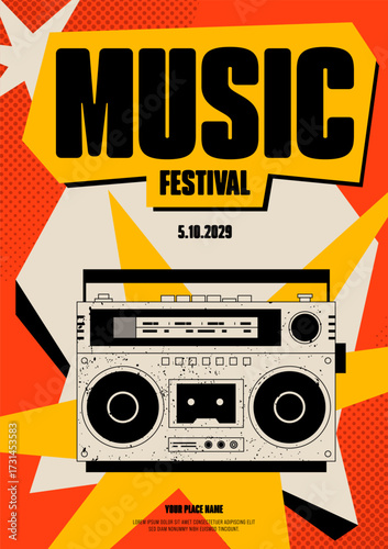 Obraz premium Vintage music festival poster template design. A retro boombox maximalism style with a grunge texture and geometric shape