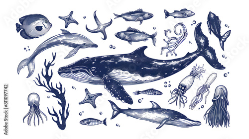 Fototapeta premium Vintage navy blue Hand drawn illustration of realistic ocean animals, sea stars, whale, seaweed, fish, squids isolated on white background