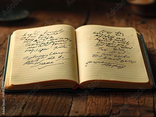 Obraz premium Vintage notebook open on rustic wooden surface, filled with handwritten...