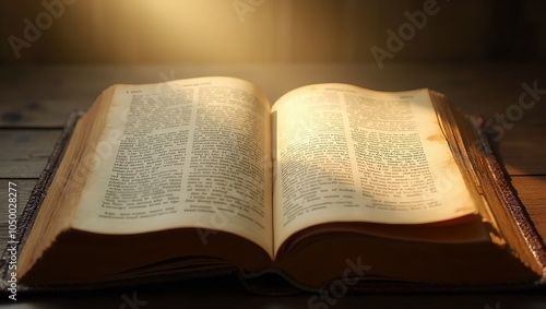 Obraz premium Vintage open book on wooden table under soft light symbolizing accumulated wisdom