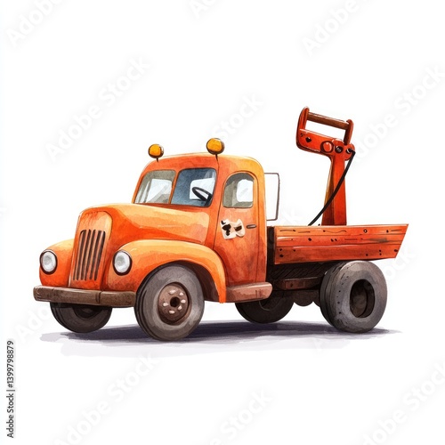 Fototapeta premium Vintage orange tow truck illustration. A charming, hand-painted depiction of a weathered, orange tow truck, with a wooden bed and a crane arm.