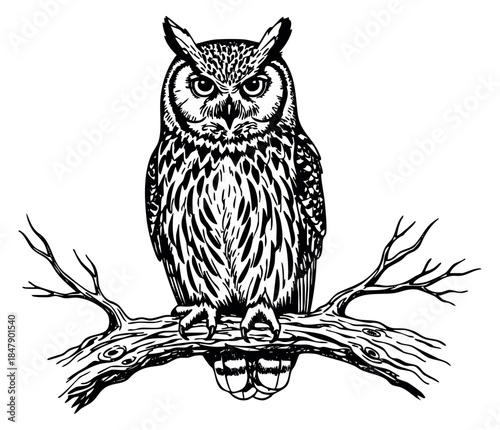 © cac_tus, Fototapeta premium Vintage owl illustration with tree branch black and white line art