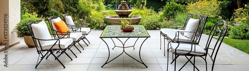Fototapeta premium Vintage patio with wrought iron chairs, a mosaic table, and an antique garden fountain