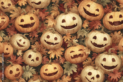 Obraz premium Vintage pattern of Halloween pumpkins with carved smiling faces.