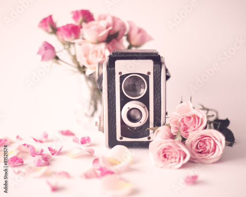 © Andreka Photography, Fototapeta premium Vintage peonies and old photo camera