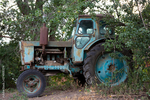 © Ekaterina, Obraz premium Vintage photo - an old blue tractor standing under a green branching tree