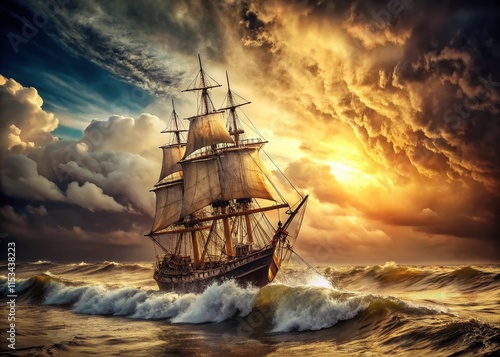 © Arnada, Obraz premium Vintage Photo: Old Sailing Ship on a Rough Sea