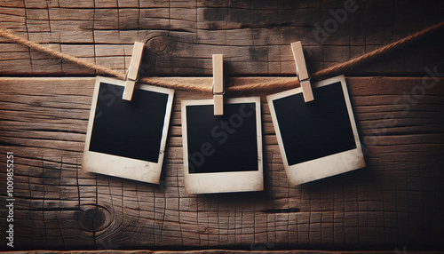 Fototapeta premium Vintage Polaroid Photos on Rustic Wooden Surface