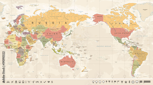 © Porcupen, Fototapeta premium Vintage Political World Map Pacific Centered