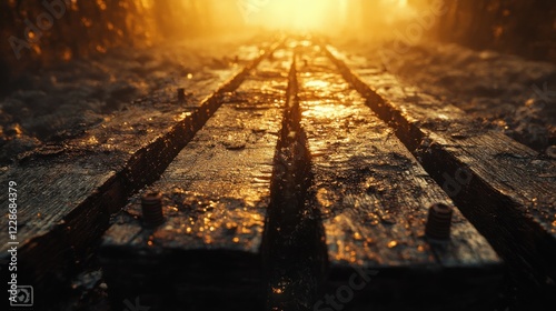 © zhuan, Naklejka premium Vintage Railway Tracks Bathed in Sunlight