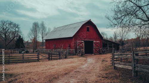 Obraz premium Vintage Red Barn Surrounded by Peaceful Fields