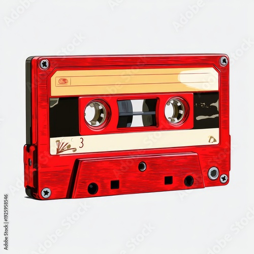 © Ainun, Naklejka premium Vintage red cassette tape with worn labels, isolated on a white background