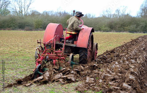 © harlequin9, Naklejka premium Vintage red International 1930's tractor ploughing field.