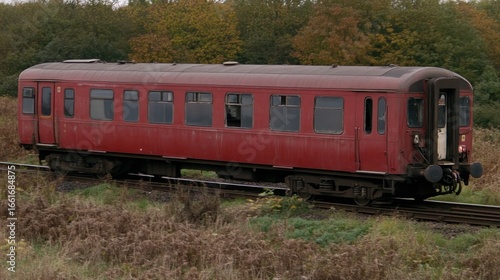 © Ahmad, Fototapeta premium Vintage red train carriage standing idle on the tracks amidst lush vegetation scene