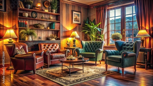Naklejka premium Vintage Retro Armchairs in a Cozy Living Room Setting with Warm Lighting and...