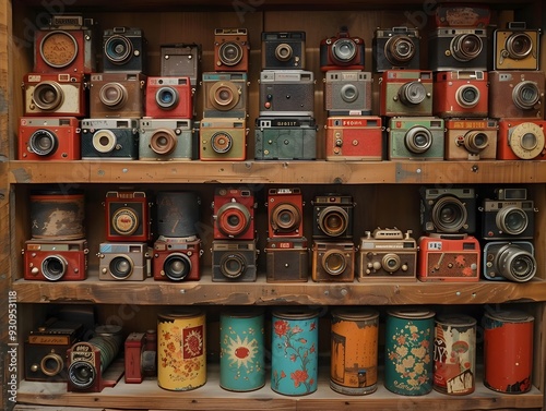 © panu101, Fototapeta premium Vintage Retro Collection on Wooden Shelf,Capturing Photography Nostalgia and Analog Treasures