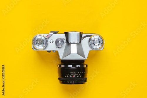 Naklejka premium Vintage retro film camera on yellow background. Top view