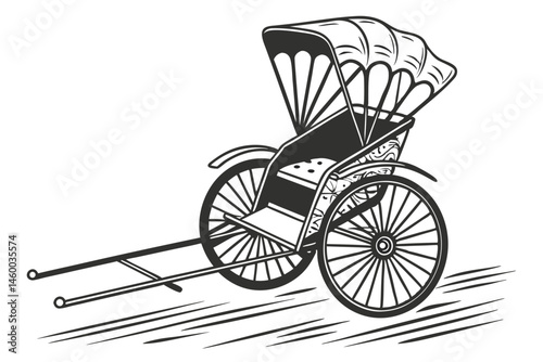 Fototapeta premium 58 vintage rickshaw, bicycle-powered carriage, black and white illustration, intricate details, side view, traditional Asian transportation, woodcut style, high contrast, historical vehicle, ornate ca