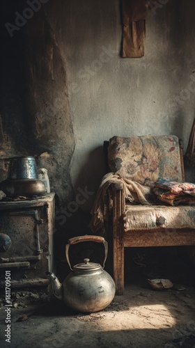 © Daphne, Fototapeta premium Vintage room interior with worn armchair and rustic kettle near old stove