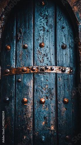 Fototapeta premium vintage rustic dark blue wooden door with metal hardware and weathered texture