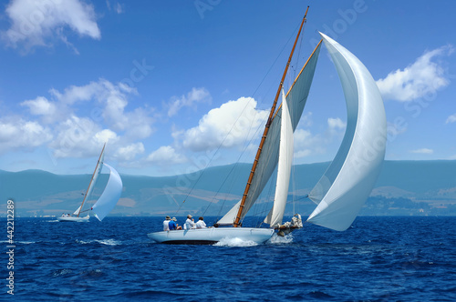 © Giovanni Rinaldi, Obraz premium Vintage sailboat with white spinnaker sailing downwind