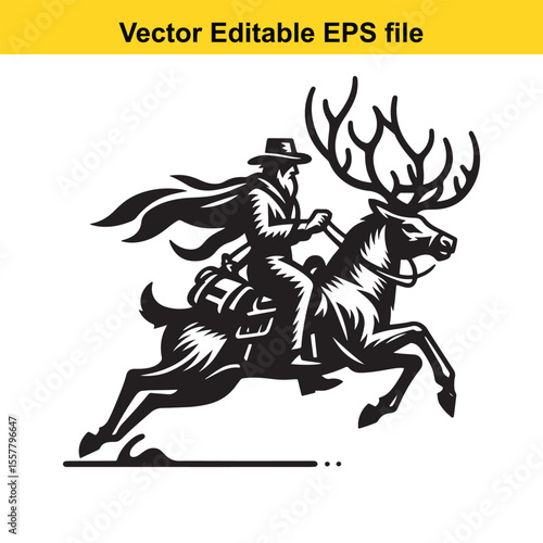 Fototapeta premium Vintage Santa Claus Riding Reindeer Through Forest Engraving Vector...