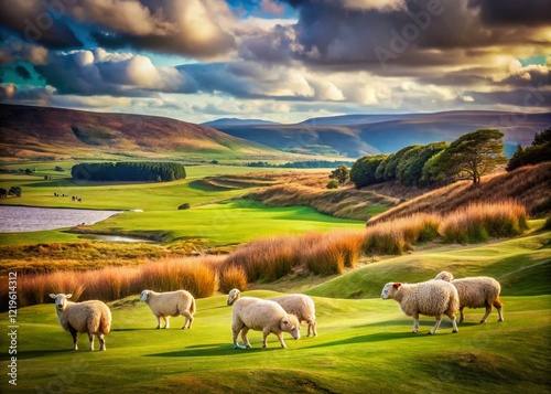 © Sirinporn, Fototapeta premium Vintage Scottish Highlands: Sheep Grazing on Brora Golf Course