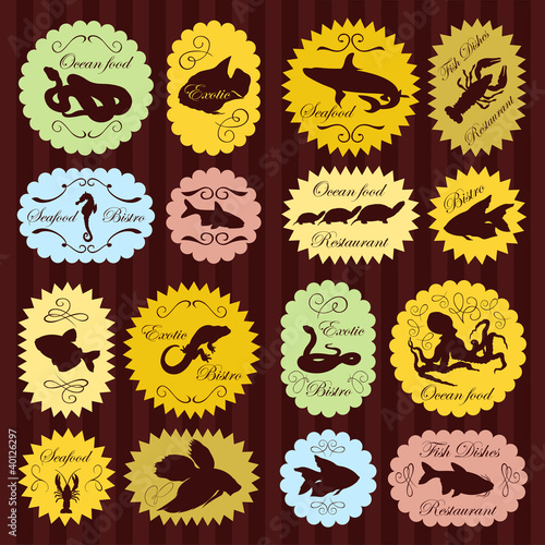 © kstudija, Fototapeta premium Vintage seafood labels illustration collection background