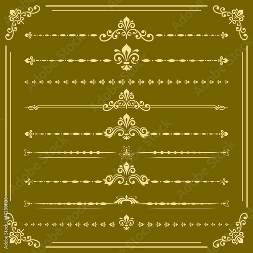 © Fine Art Studio, Fototapeta premium Vintage set of vector golden elements. Horizontal separators in the frame. Collection of different ornaments. Classic golden patterns. Set of vintage patterns