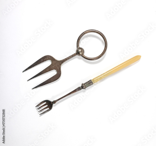 © Kathleen, Fototapeta premium Vintage silver pickle forks isolated on white background