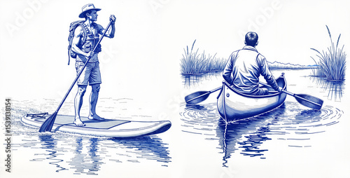 © Natalia, Naklejka premium Vintage sketch in blue ink, collage on white background depicting canoeing trip and paddleboarding travel