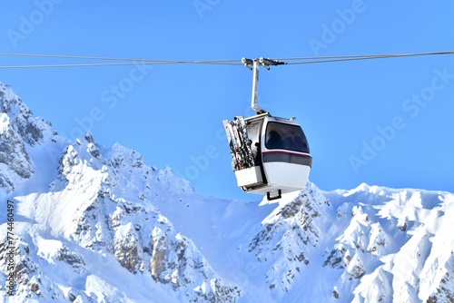 Obraz premium Vintage ski lift over the ski slopes of French alps.