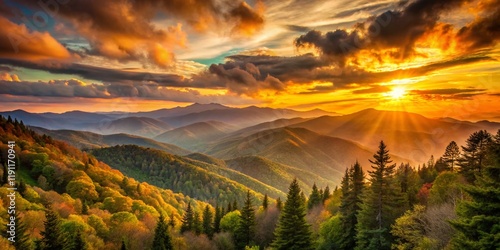 © Four888, Naklejka premium Vintage Smoky Mountains Sunset: Breathtaking Panoramic View