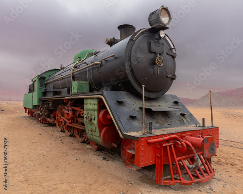 © IrenaB, Fototapeta premium Vintage steam engine in the desert in Jordan