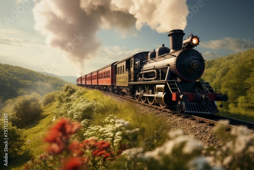 © Michael Böhm, Obraz premium Vintage steam locomotive chugging through countryside