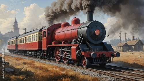 © Ihor Voron, Obraz premium Vintage Steam Locomotive Countryside Illustration, Red Steam Engine Historical Railway Painting