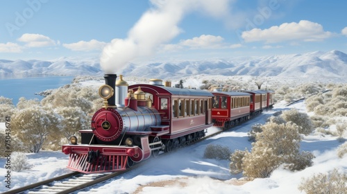 Obraz premium Vintage steam locomotive pulling train against picturesque winter landscape,...