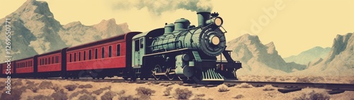 Fototapeta premium Vintage steam locomotive traveling through desert landscape with mountains...