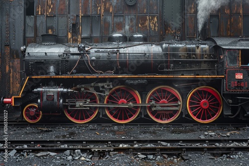 © Matvejs, Naklejka premium Vintage steam locomotive with distinct red wheels on rails, showcasing classic black design