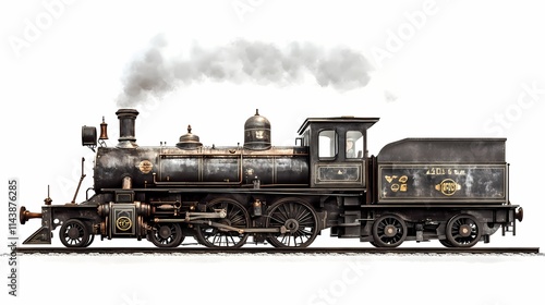Naklejka premium Vintage Steam Locomotive with Smoke Emitting from the Stack on a White Background, Showcasing Classic Railroad Design and Historic Engineering